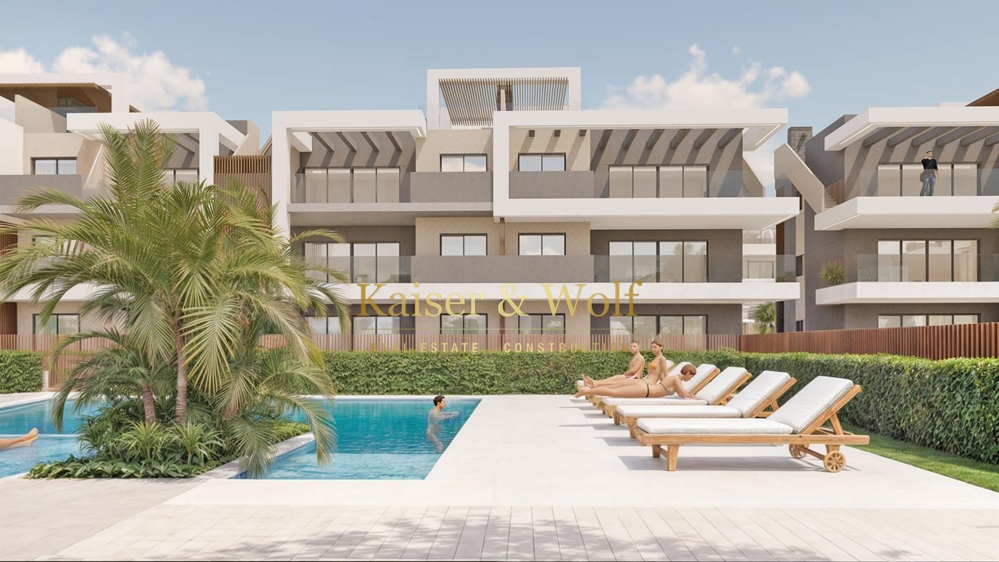 Las primeras fases cuentan con modernos edificios de tres alturas, mientras que las restantes ofrecen construcciones de dos plantas que aportan un ambiente más íntimo y exclusivo. Las viviendas, todas de tres dormitorios y dos baños —uno de ellos en suite, destacan por su distribución abierta que integra salón, comedor y cocina en un espacio amplio y luminoso, creando un entorno ideal para disfrutar en familia o con amigos. Además, cada apartamento dispone de amplias terrazas donde el clima privilegiado de la zona se convierte en protagonista. Se puede elegir entre plantas bajas con jardín privado, viviendas en planta intermedia con generosos balcones o espectaculares áticos con solárium privado y vistas al mar Mediterráneo. Todas las propiedades incluyen plaza de aparcamiento y trastero.